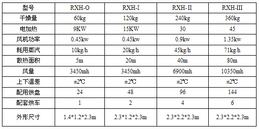 简介:·主要用于制药、食品、化工、电子行业产品的干燥。·不锈钢制作,主要由热源,风机,烘盘和烘车组成。·以蒸汽或电源为热源,通过热交换器加热后,热风经风机牵引在箱内循环流动并与物料进行热交换,带走物料挥发的湿气,干燥物料。技术参数: